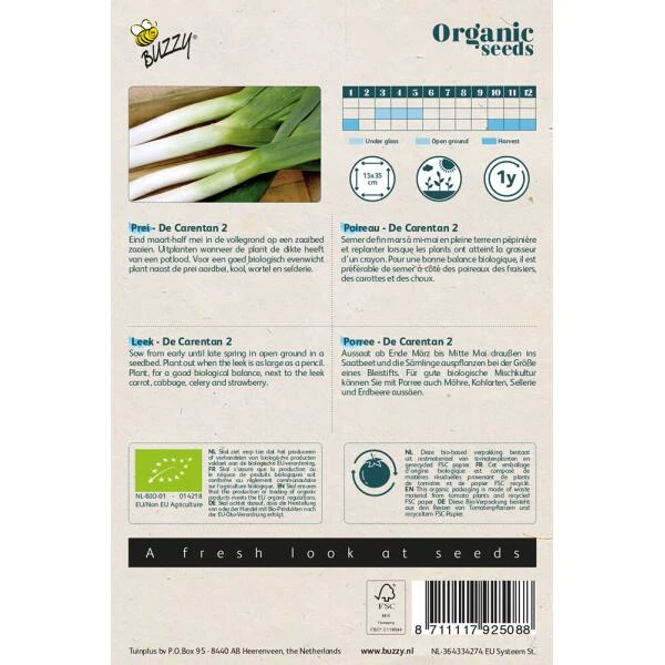 Kweek zelf prei op een biologische manier en start met biologische zaden. Herfstprei Carentan 2 kan je zaaien vanaf eind maart tot half mei in de volle grond op een zaaibed. Uitplanten kan wanneer de plant de dikte heeft van een potlood. Deze soort is bijzonder winterhard en kan ook worden ingevroren.
