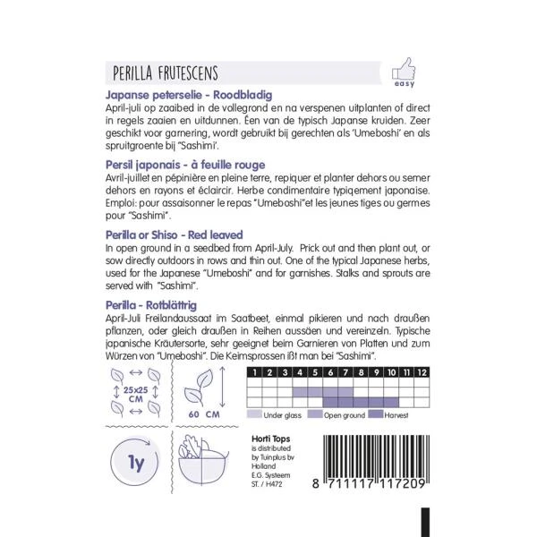 Eénjarige roodbladige peterselie-soort die tot 60 cm hoog wordt. Een typisch Japans kruid dat als garnering wordt gebruikt bij gerechten als ‘Umeboshi’ en als spruitgroente bij ‘Sashimi’.