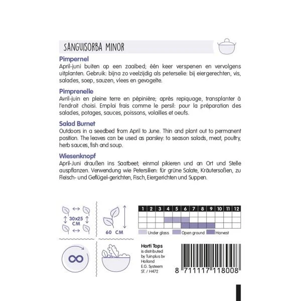 Pimpernel is bijna zo veelzijdig als peterselie. Past bij tal van gerechten zoals eieren, vis, salades, soep, vlees of gevogelte. Deze overblijvende vaste plant wordt tot 60 cm hoog.