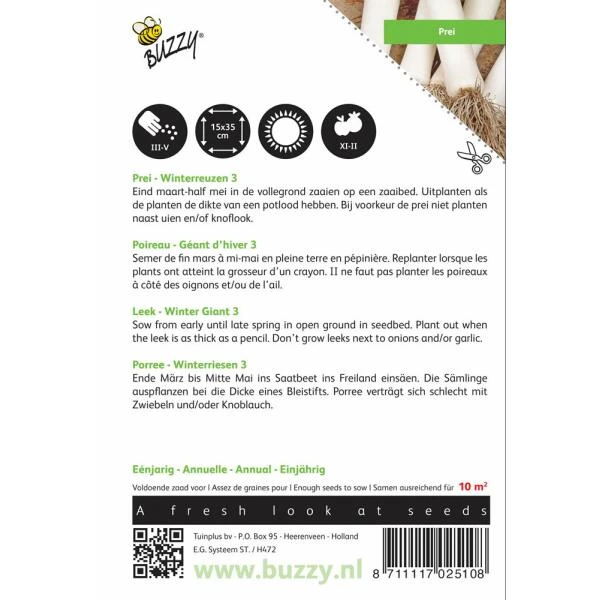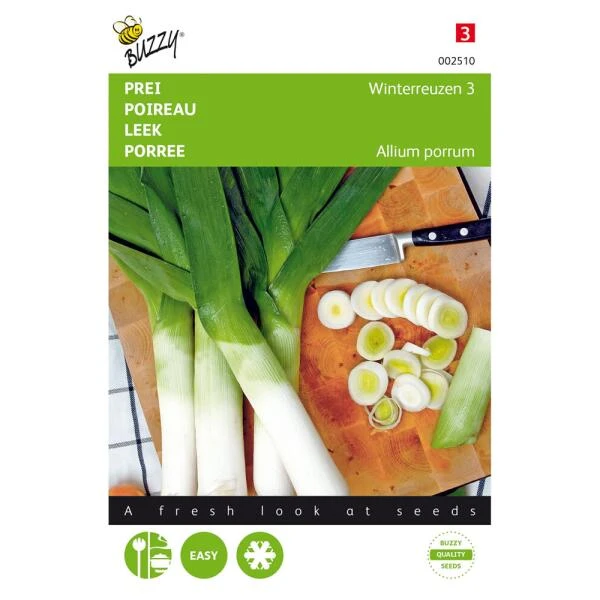 Zaden Prei winterreuzen zaaien: eind maart tot half mei in de vollegrond op zaaibed en uitplanten als de plantjes de dikte hebben van een potlood. Bij voorkeur prei niet planten naast uien en/of knoflook.