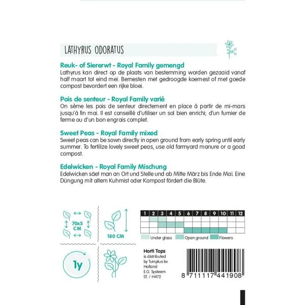 Hoge, klimmende siererwten, welke zeer aangenaam geuren. Dit ‘Royal’ zaadmengsel geeft een rijk scala aan zachte bloemkleuren, welke al vroeg bloeien.