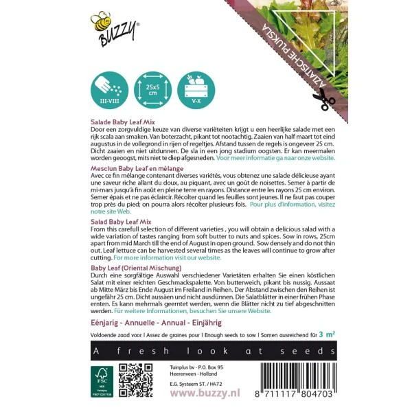 Zaden Salade Baby leaf mix zaaien: van half maart tot eind augustus in de vollegrond in rijen of regeltjes. Afstand tussen de regels is ongeveer 25 cm. Dicht zaaien en niet uitdunnen. De sla in een jong stadium oogsten. Er kan meermalen worden geoogst, mits niet te diep afgesneden.