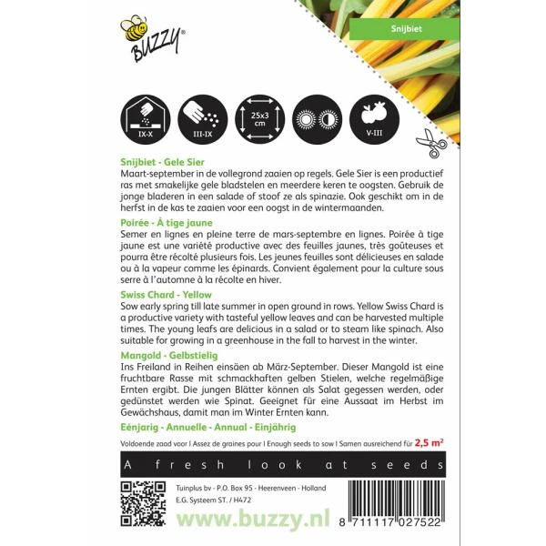 Snijbiet Gele Sier heeft kleurrijke gele bladstelen die lekker zijn van smaak. Het is een productief ras waarvan je meerdere malen kunt oogsten. De bladeren en stelen kan je stoven zoals spinazie of rauw verwerken in een jong stadium.