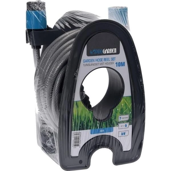 De set bevat een houder, een tuinslang met een lengte van 10 meter, een sproeikop en 2 koppelingen.