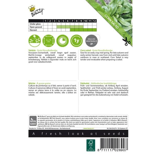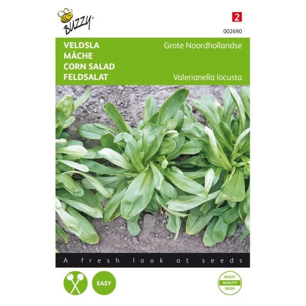 Zaden Veldsla grote noordhollandse zaaien: voorjaars- en zomerteelt vanaf begin april buiten, op een beschutte plaats, in regels met 12-15 cm tussenruimte. Voor de late herfstteelt wordt vanaf begin augustus tot half september nog buiten in de volle grond gezaaid, maar voor de winterteelt vanaf eind september tot eind oktober onder glas. In het laatste geval zaait men breedwerpig. Veldsla altijd dicht zaaien en niet uitdunnen. De plantafstand moet ongeveer 3 Ã 4 cm zijn. Na het zaaien het zaad licht inharken en de grond aandrukken. Het zaaibed dient goed vochtig gehouden te worden.